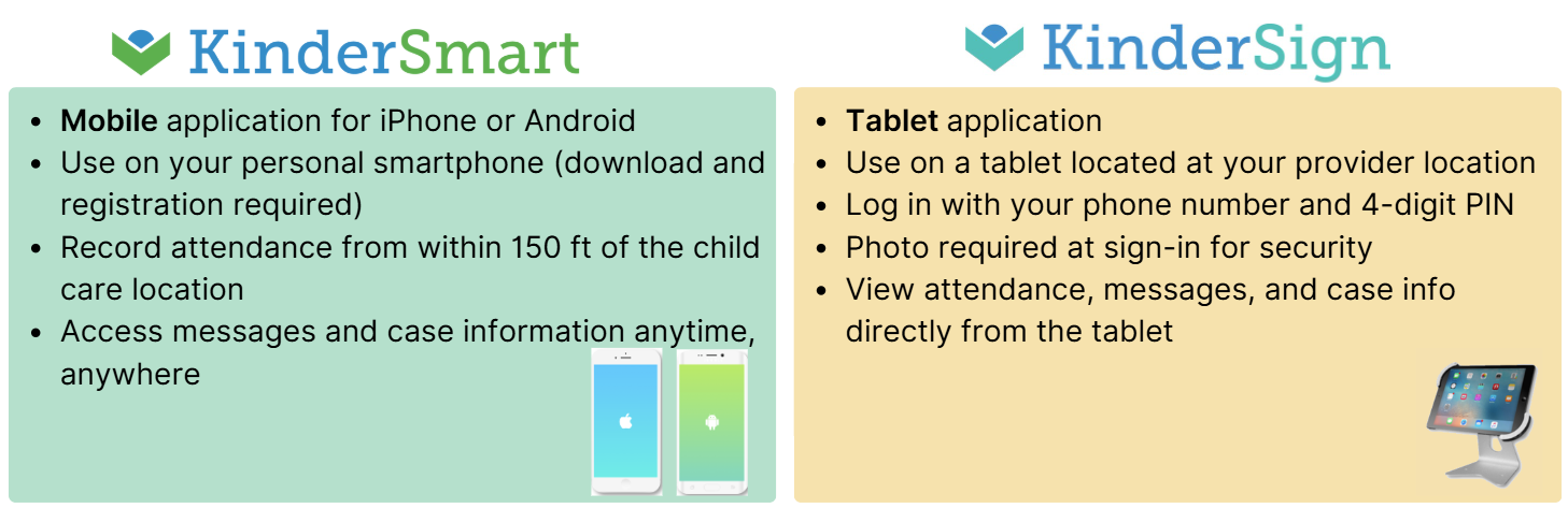 As a sponsor, you are responsible for tracking attendance each day. PASS offers two products to make attendance tracking easy: KinderSign (tablet) or KinderSmart (mobile). See the image below to learn more about each product and select the method that works best for you—you can use either one or both.